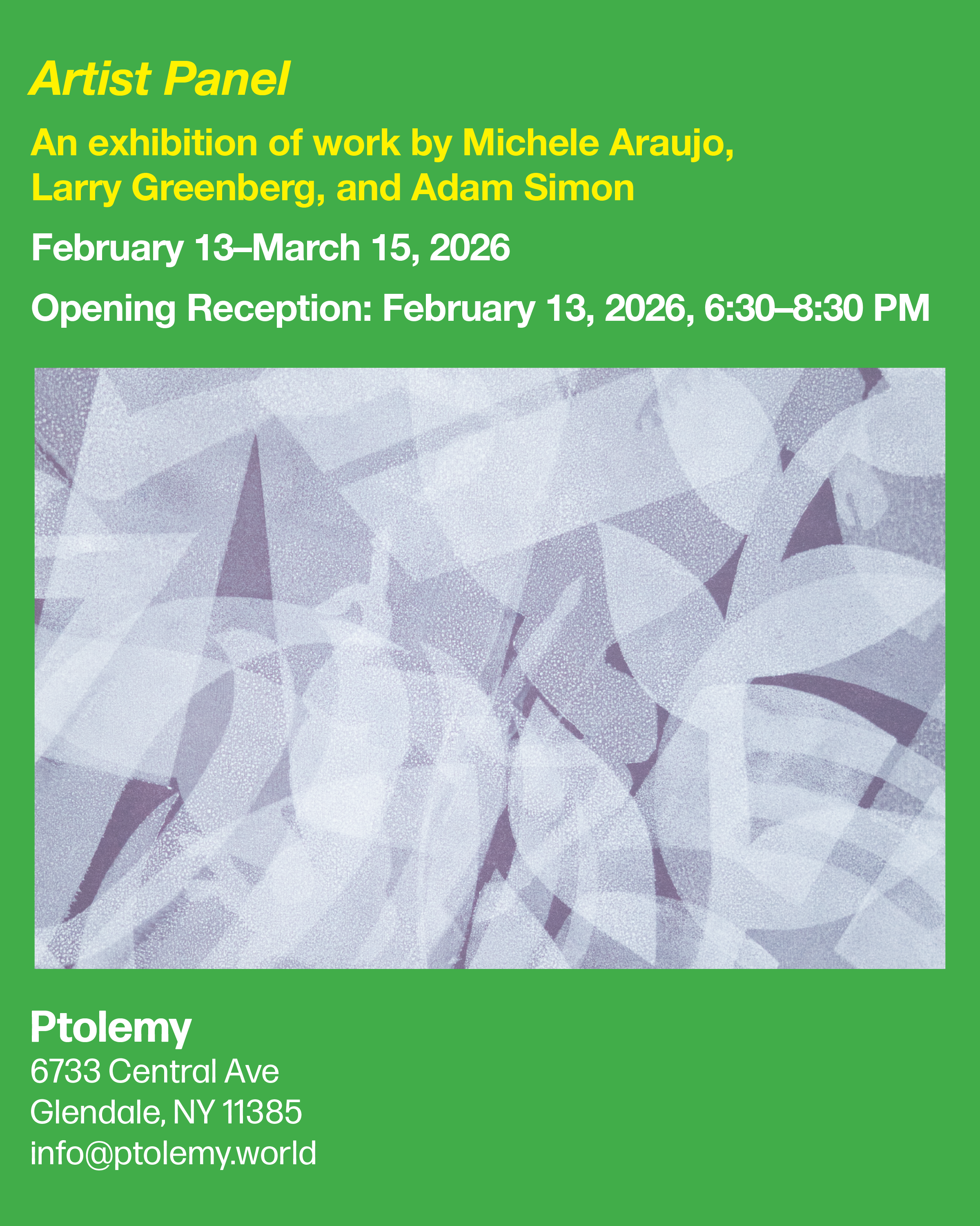 Michele Araujo, Larry Greenberg, Adam Simon: Artist PanelFebruary 13–March 15, 2026Opening February 13, 2026, 6:30–8:30 PM